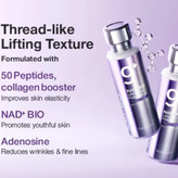 فرمولاسیون این سرم نه تنها بر پایه NAD+ استوار است، بلکه با مجموعهای از پپتیدهای قوی غنی شده است. پپتیدها، پروتئینهای کوچک اما مؤثری هستند که به طور مستقیم تولید کلاژن و الاستین را در پوست تحریک میکنند. کلاژن و الاستین دو پروتئین اساسی برای حفظ ساختار، استحکام و انعطافپذیری پوست هستند. با افزایش تولید این پروتئینها، پوست سفتتر شده، افتادگی آن کاهش مییابد و خطوط و چروکهای موجود به وضوح کمتر میشوند.