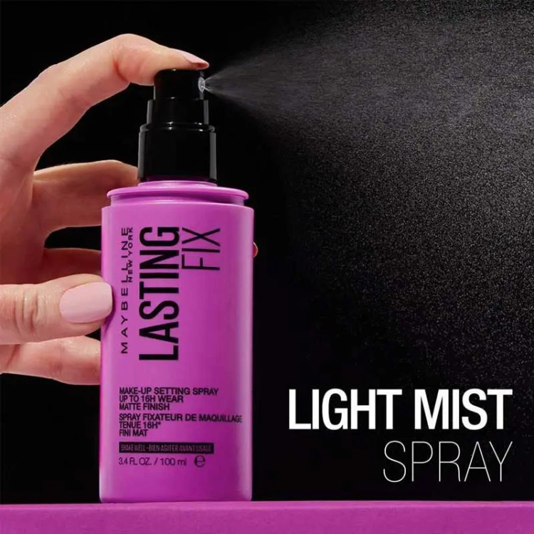 اسپری فیکساتور Lasting Fix میبلین ماندگاری آرایش شما را مات و تا 16 ساعت نگه می دارد, نگهدارنده کرم پودر , پودر های صورت ، سایه چشم و ابرو برای 16 ساعت. با اسپری فیکس جدید ما حداکثر مات کنندگی(پوستایی که بعد چند ساعت روغنی براق میشن) و نگهداری طولانی مدت میکاپ را بدست آورید. این اسپری با بافتی سبک و کنترل کننده براقیت می باشد که پایانی مات و ماندگار در طول روز دوام می آورد.