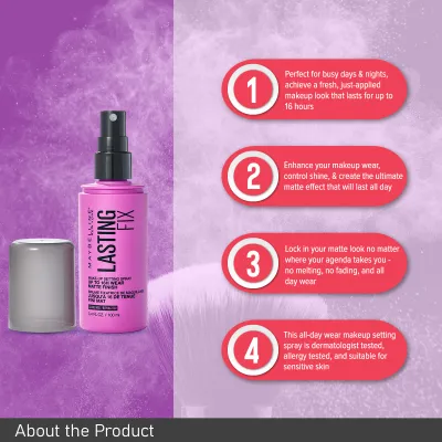 اسپری فیکساتور Lasting Fix میبلین ماندگاری آرایش شما را مات و تا 16 ساعت نگه می دارد, نگهدارنده کرم پودر , پودر های صورت ، سایه چشم و ابرو برای 16 ساعت. با اسپری فیکس جدید ما حداکثر مات کنندگی(پوستایی که بعد چند ساعت روغنی براق میشن) و نگهداری طولانی مدت میکاپ را بدست آورید. این اسپری با بافتی سبک و کنترل کننده براقیت می باشد که پایانی مات و ماندگار در طول روز دوام می آورد.